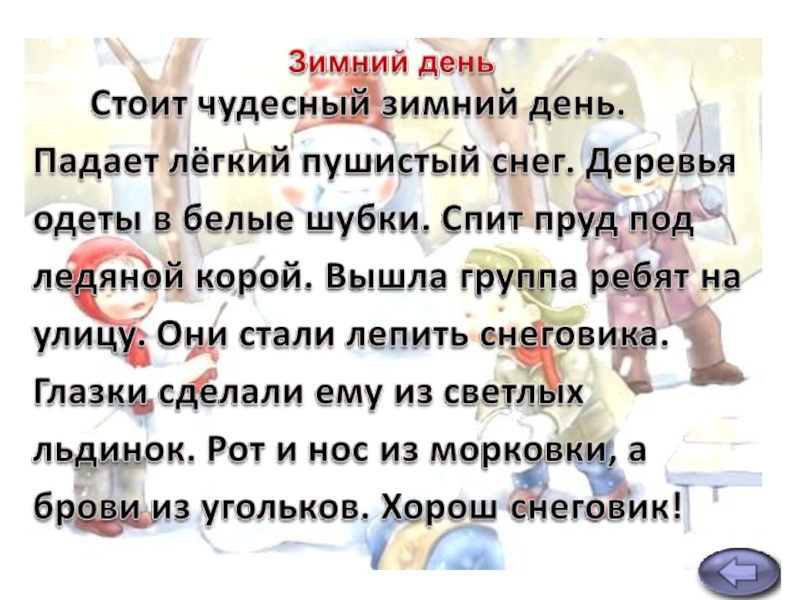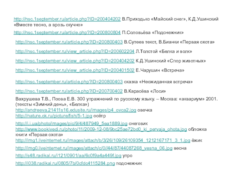 Вахрушева Т.В., Поова Е.В. 300 упражнений по русскому языку. – Москва: «аквариум» 2001. (тексты «Зимний день», «Белка»)