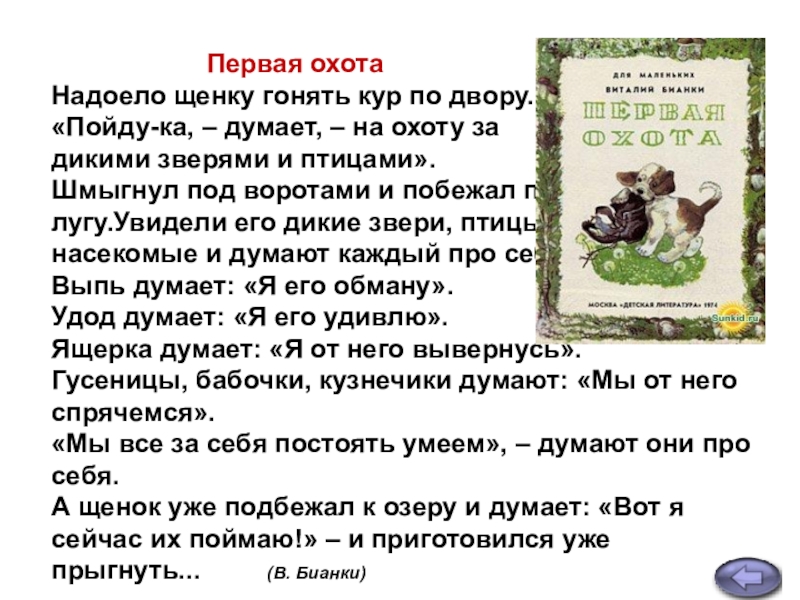 http://nsc.1september.ru/article.php?ID=200800403 В.Сутеев текст, В.Бианки «Первая охота»