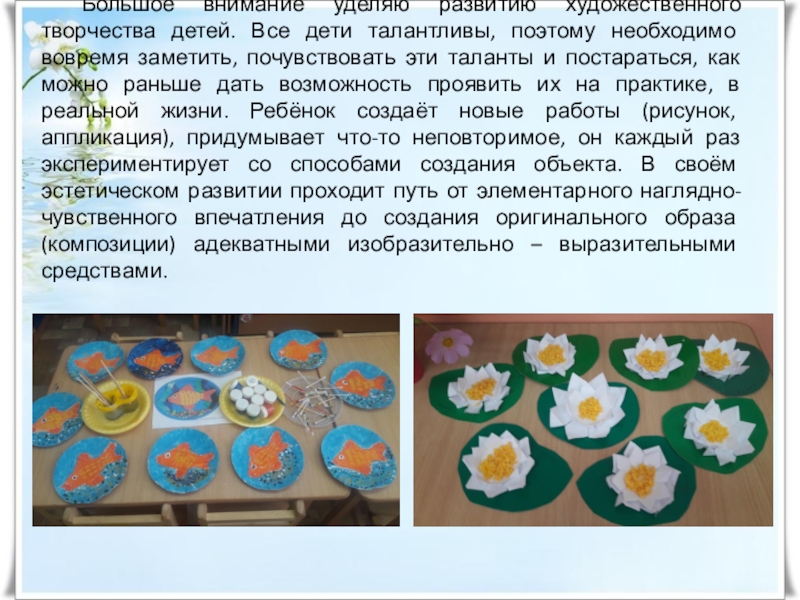 Слайд 12 Большое внимание уделяю развитию художественного творчества детей. Все дети талантливы, поэтому