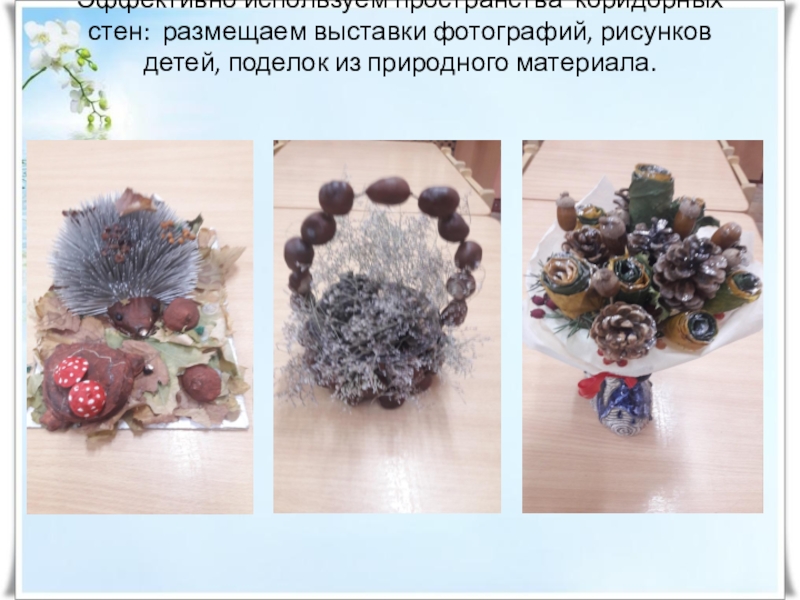 Слайд 11Эффективно используем пространства коридорных стен: размещаем выставки фотографий, рисунков детей, поделок