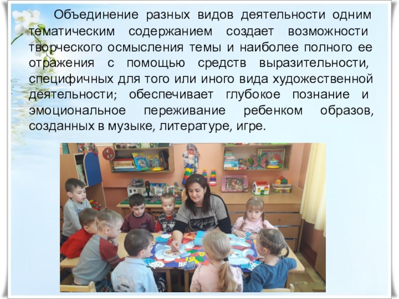 Слайд 8 Объединение разных видов деятельности одним тематическим содержанием создает возможности творческого осмысления