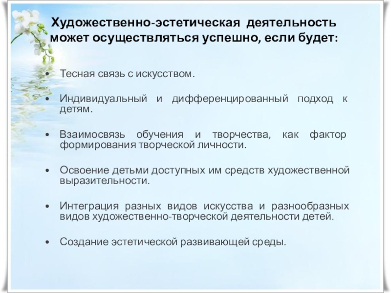 Слайд 7Художественно-эстетическая деятельность может осуществляться успешно, если будет: