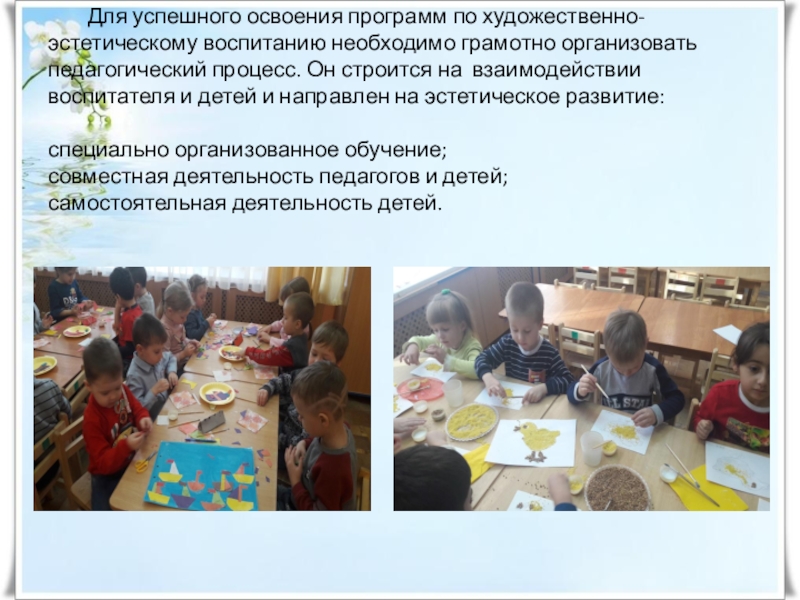 Слайд 4 Для успешного освоения программ по художественно-эстетическому воспитанию необходимо грамотно организовать педагогический