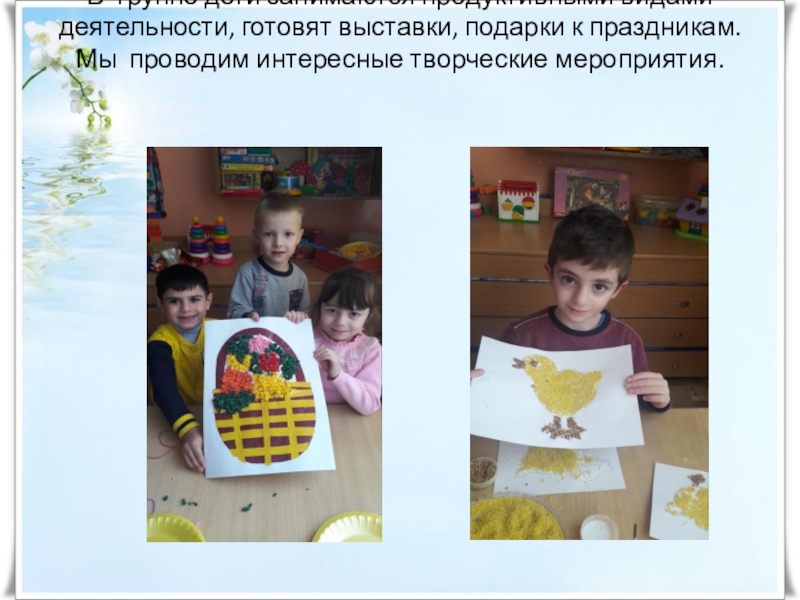 Слайд 9В группе дети занимаются продуктивными видами деятельности, готовят выставки, подарки к