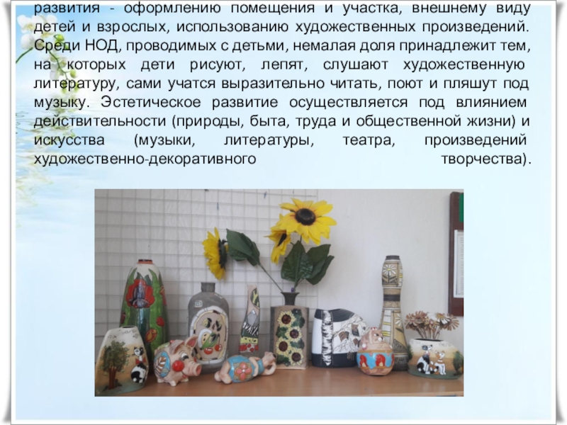 участка, внешнему виду детей и взрослых, использованию художественных произведений. Среди НОД, проводимых с детьми, немалая доля принадлежит тем, на которых дети рисуют, лепят, слушают художественную литературу, сами учатся выразительно читать, поют и пляшут под музыку. Эстетическое развитие осуществляется под влиянием действительности (природы, быта, труда и общественной жизни) и искусства (музыки, литературы, театра, произведений художественно-декоративного творчества).
