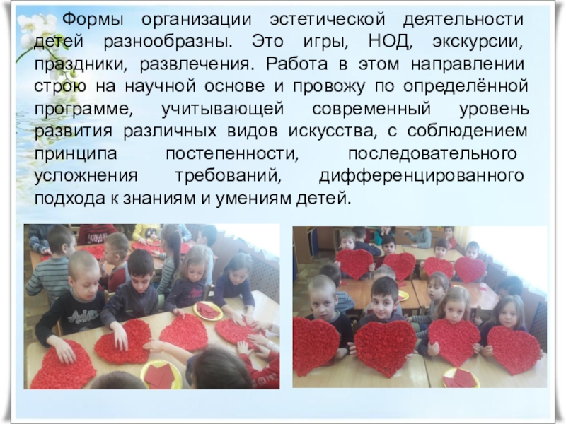 Слайд 6 Формы организации эстетической деятельности детей разнообразны. Это игры, НОД, экскурсии, праздники,