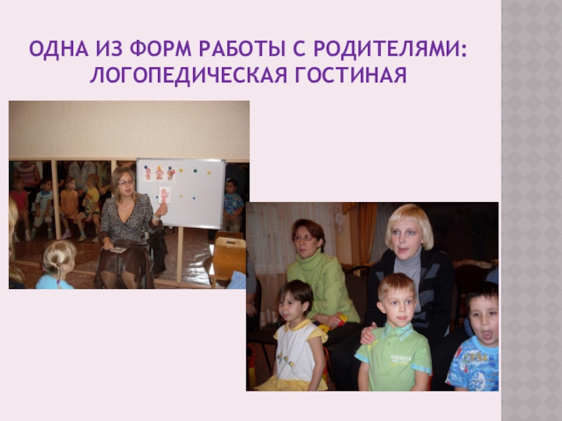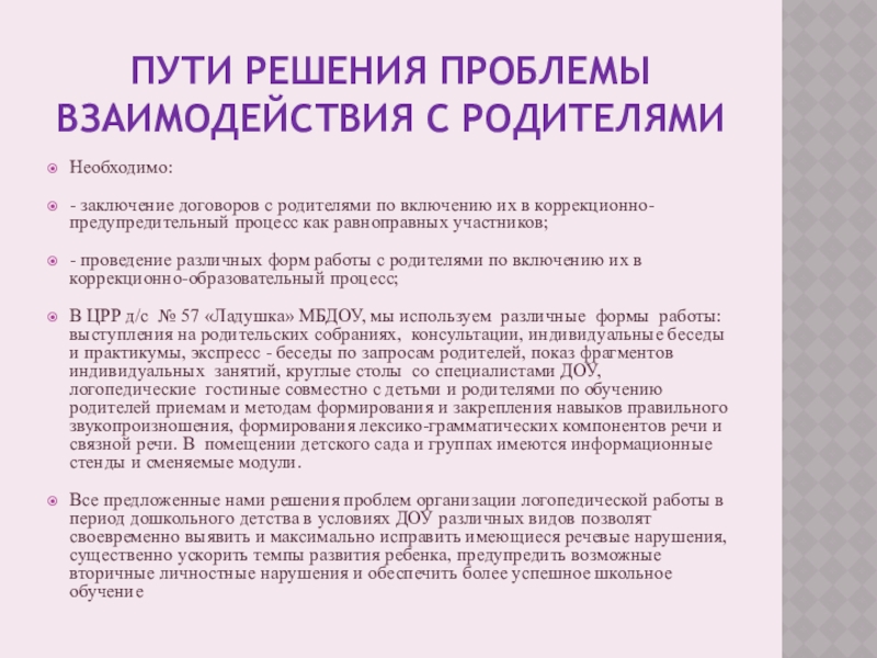 В ЦРР д/с № 57 «Ладушка» МБДОУ, мы используем различные формы работы: выступления на родительских собраниях, консультации, индивидуальные беседы и практикумы, экспресс - беседы по запросам родителей, показ фрагментов индивидуальных занятий, круглые столы со специалистами ДОУ, логопедические гостиные совместно с детьми и родителями по обучению родителей приемам и методам формирования и закрепления навыков правильного звукопроизношения, формирования лексико-грамматических компонентов речи и связной речи. В помещении детского сада и группах имеются информационные стенды и сменяемые модули.