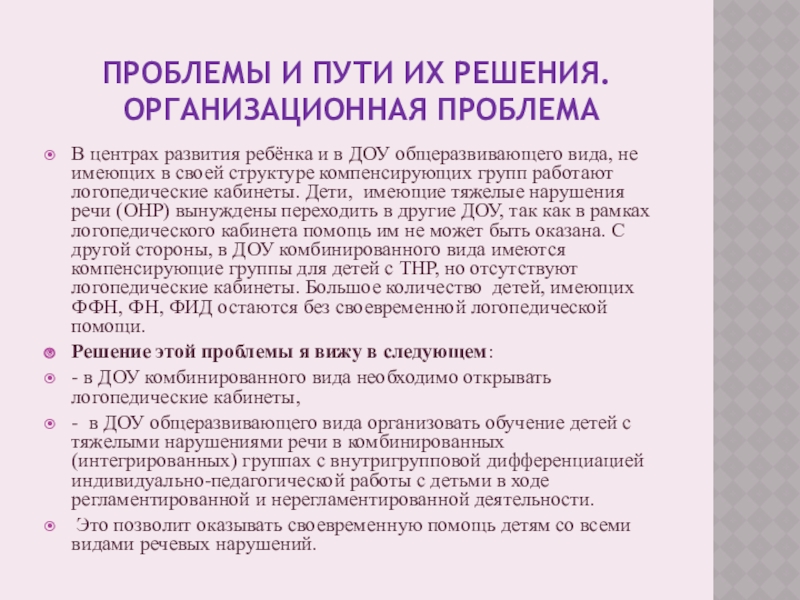 в ДОУ общеразвивающего вида, не имеющих в своей структуре компенсирующих групп работают логопедические кабинеты. Дети, имеющие тяжелые нарушения речи (ОНР) вынуждены переходить в другие ДОУ, так как в рамках логопедического кабинета помощь им не может быть оказана. С другой стороны, в ДОУ комбинированного вида имеются компенсирующие группы для детей с ТНР, но отсутствуют логопедические кабинеты. Большое количество детей, имеющих ФФН, ФН, ФИД остаются без своевременной логопедической помощи.