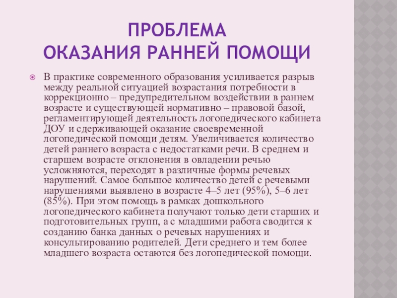 ситуацией возрастания потребности в коррекционно – предупредительном воздействии в раннем возрасте и существующей нормативно – правовой базой, регламентирующей деятельность логопедического кабинета ДОУ и сдерживающей оказание своевременной логопедической помощи детям. Увеличивается количество детей раннего возраста с недостатками речи. В среднем и старшем возрасте отклонения в овладении речью усложняются, переходят в различные формы речевых нарушений. Самое большое количество детей с речевыми нарушениями выявлено в возрасте 4–5 лет (95%), 5–6 лет (85%). При этом помощь в рамках дошкольного логопедического кабинета получают только дети старших и подготовительных групп, а с младшими работа сводится к созданию банка данных о речевых нарушениях и консультированию родителей. Дети среднего и тем более младшего возраста остаются без логопедической помощи.