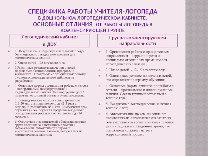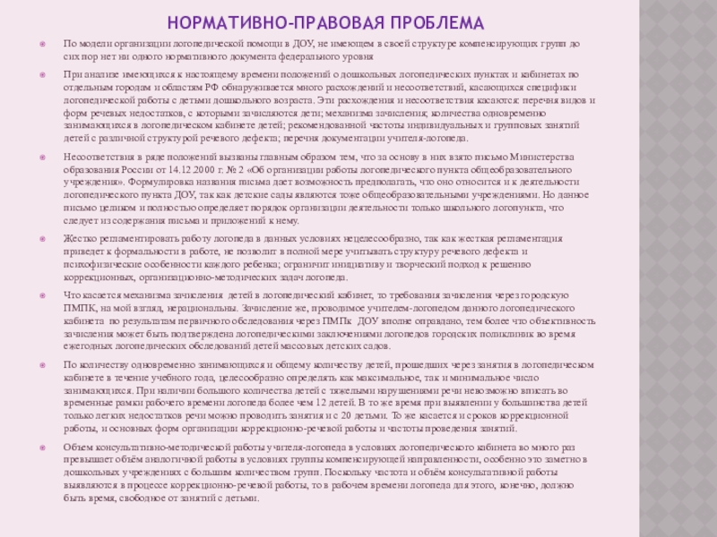 При анализе имеющихся к настоящему времени положений о дошкольных логопедических пунктах и кабинетах по отдельным городам и областям РФ обнаруживается много расхождений и несоответствий, касающихся специфики логопедической работы с детьми дошкольного возраста. Эти расхождения и несоответствия касаются: перечня видов и форм речевых недостатков, с которыми зачисляются дети; механизма зачисления; количества одновременно занимающихся в логопедическом кабинете детей; рекомендованной частоты индивидуальных и групповых занятий детей с различной структурой речевого дефекта; перечня документации учителя-логопеда.