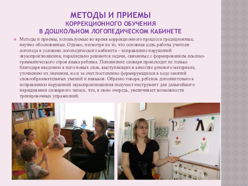 во время коррекционного процесса традиционные, научно-обоснованные. Однако, несмотря на то, что основная цель работы учителя-логопеда в условиях логопедического кабинета – исправление нарушений звукопроизношения, параллельно решаются задачи, связанные с формированием лексико-грамматического строя языка ребенка. Пополнение словаря происходит не только благодаря введению в него новых слов, выступающих в качестве речевого материала, уточнению их значения, но и за счет постепенно формирующихся в ходе занятий словообразовательных умений и навыков. Образно говоря, ребенок дополнительно к исправлению нарушений звукопроизношения получает инструмент для дальнейшего наращивания словарного запаса, что, в свою очередь, увеличивает возможности тренировочных упражнений.