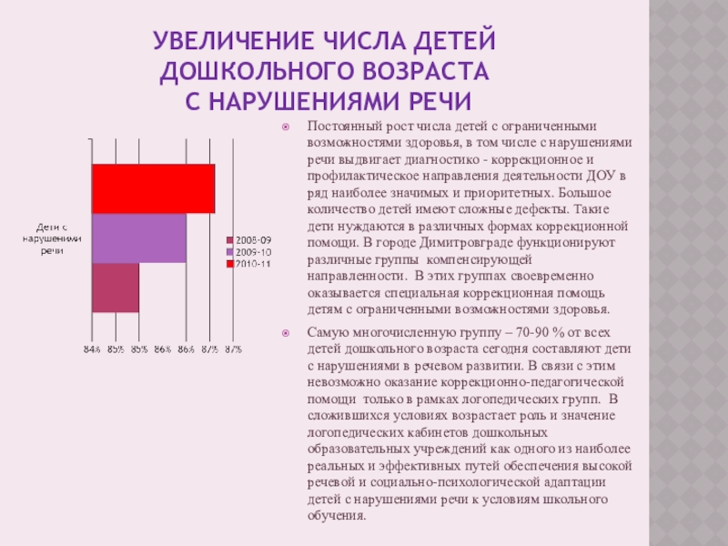 Самую многочисленную группу – 70-90 % от всех детей дошкольного возраста сегодня составляют дети с нарушениями в речевом развитии. В связи с этим невозможно оказание коррекционно-педагогической помощи только в рамках логопедических групп. В сложившихся условиях возрастает роль и значение логопедических кабинетов дошкольных образовательных учреждений как одного из наиболее реальных и эффективных путей обеспечения высокой речевой и социально-психологической адаптации детей с нарушениями речи к условиям школьного обучения.