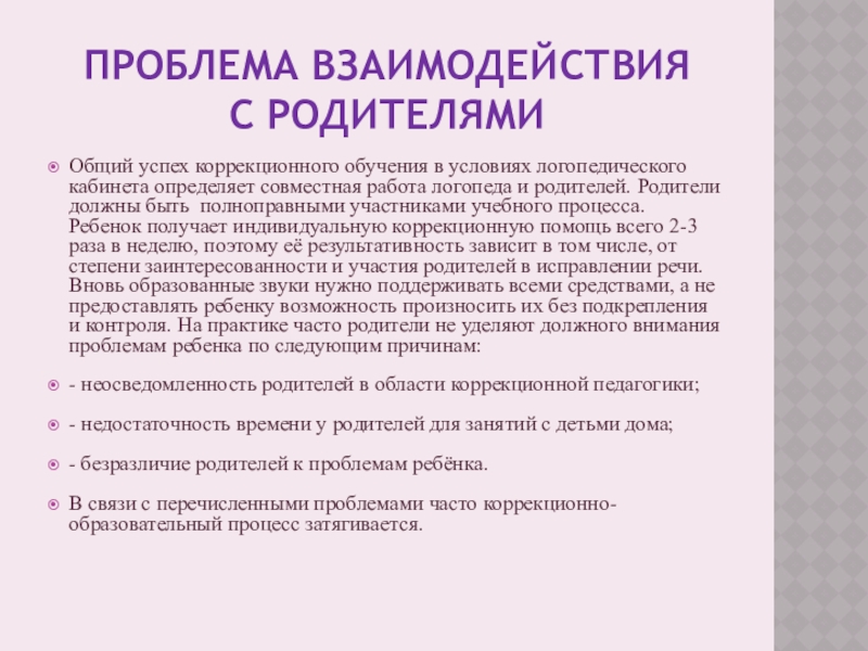 определяет совместная работа логопеда и родителей. Родители должны быть полноправными участниками учебного процесса. Ребенок получает индивидуальную коррекционную помощь всего 2-3 раза в неделю, поэтому её результативность зависит в том числе, от степени заинтересованности и участия родителей в исправлении речи. Вновь образованные звуки нужно поддерживать всеми средствами, а не предоставлять ребенку возможность произносить их без подкрепления и контроля. На практике часто родители не уделяют должного внимания проблемам ребенка по следующим причинам: