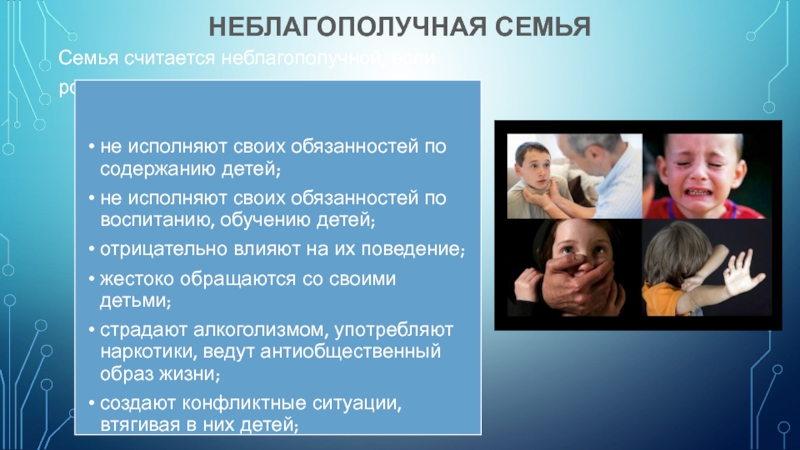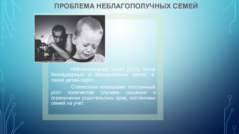 Кризис семейных институтов (высокий процент разводов, отказы от новорожденных, неполные семьи, лишение родительских прав)