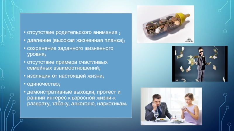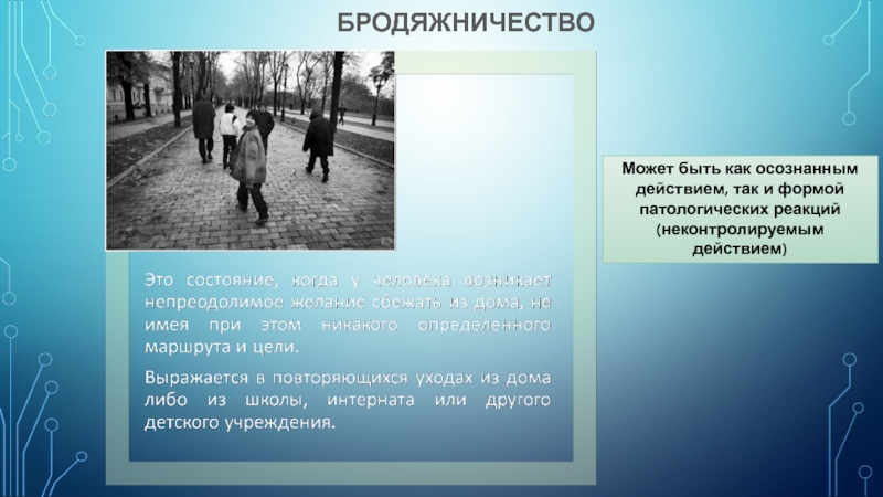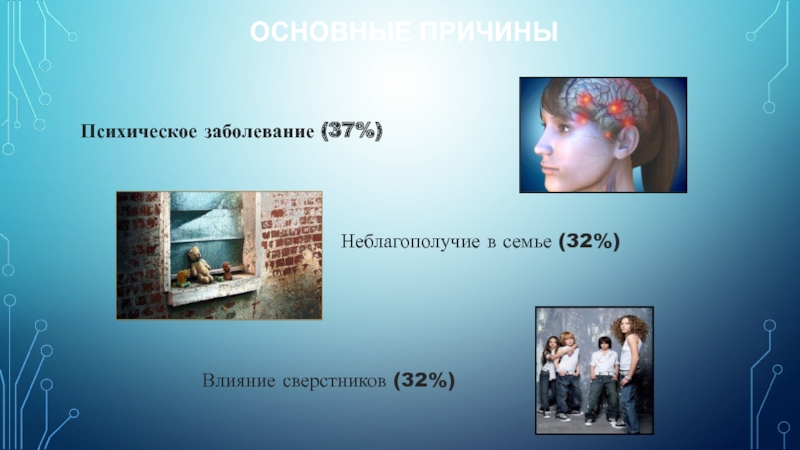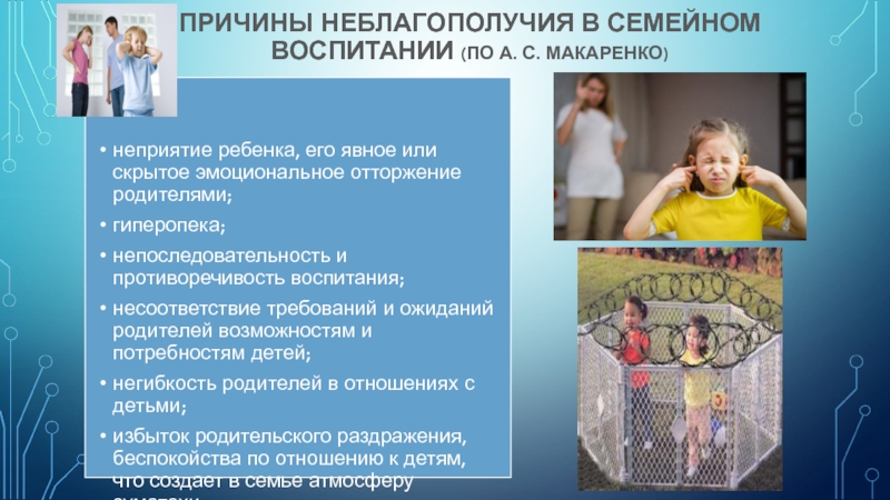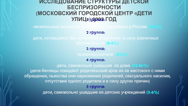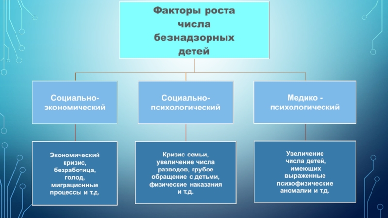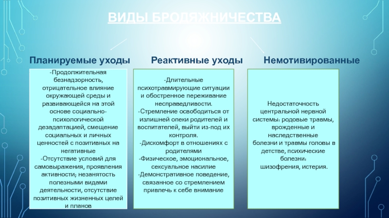 -Продолжительная безнадзорность, отрицательное влияние окружающей среды и развивающейся на этой основе социально-психологической дезадаптацией, смещение социальных и личных ценностей с позитивных на негативные