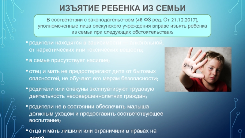 В соответствии с законодательством (48 ФЗ ред. От 21.12.2017), уполномоченные лица опекунского учреждения вправе изъять ребенка из семьи при следующих обстоятельствах:
