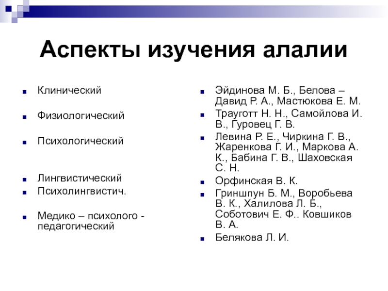 Слайд 3Аспекты изучения алалии