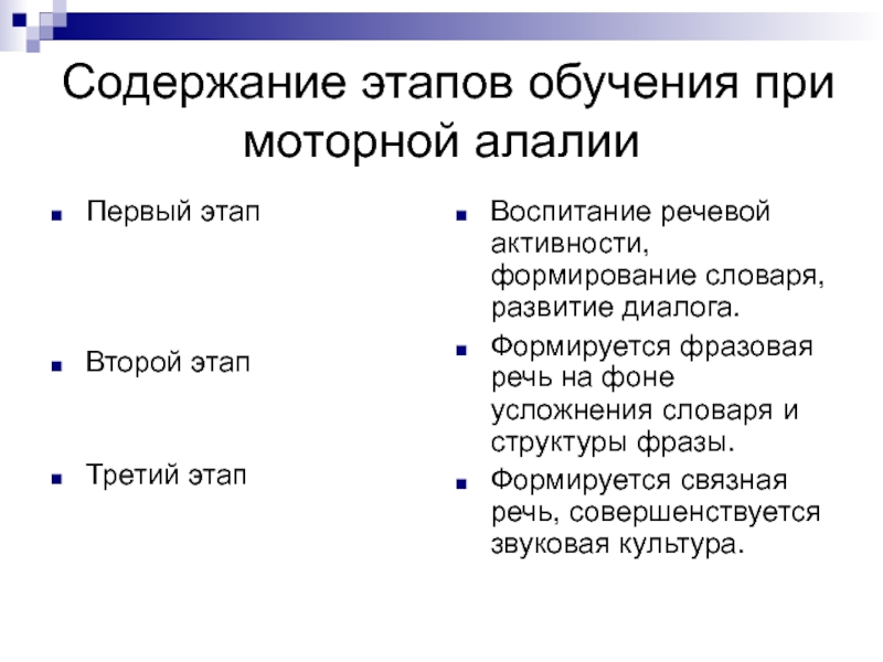Слайд 18Содержание этапов обучения при моторной алалии