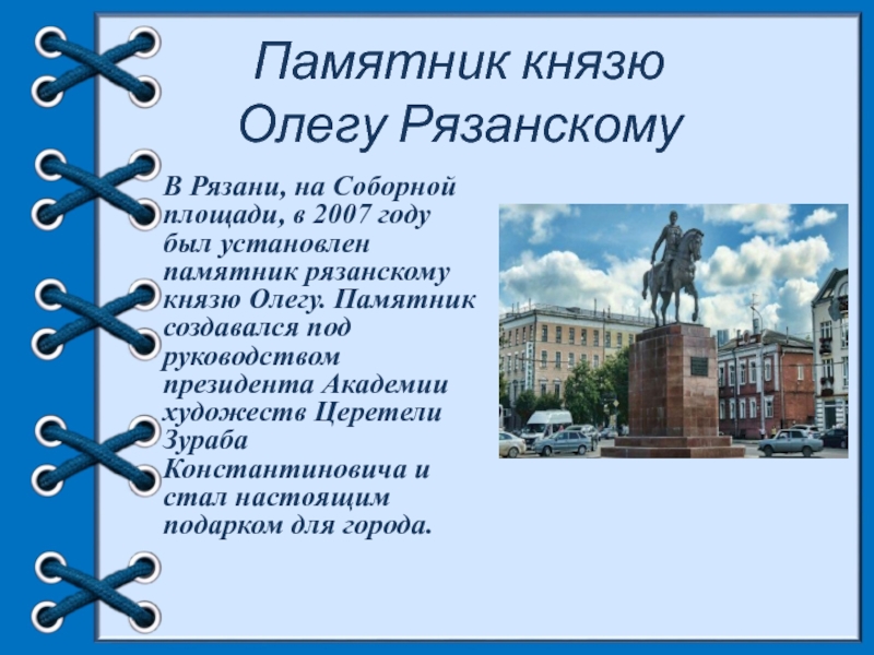 был установлен памятник рязанскому князю Олегу. Памятник создавался под руководством президента Академии художеств Церетели Зураба Константиновича и стал настоящим подарком для города.