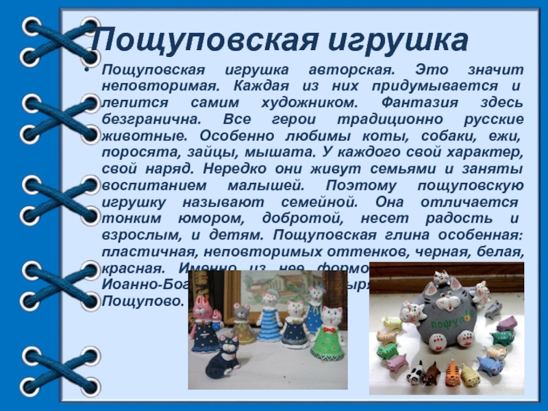 и лепится самим художником. Фантазия здесь безгранична. Все герои традиционно русские животные. Особенно любимы коты, собаки, ежи, поросята, зайцы, мышата. У каждого свой характер, свой наряд. Нередко они живут семьями и заняты воспитанием малышей. Поэтому пощуповскую игрушку называют семейной. Она отличается тонким юмором, добротой, несет радость и взрослым, и детям. Пощуповская глина особенная: пластичная, неповторимых оттенков, черная, белая, красная. Именно из нее формовали кирпичи для Иоанно-Богословского монастыря, что находится в Пощупово.