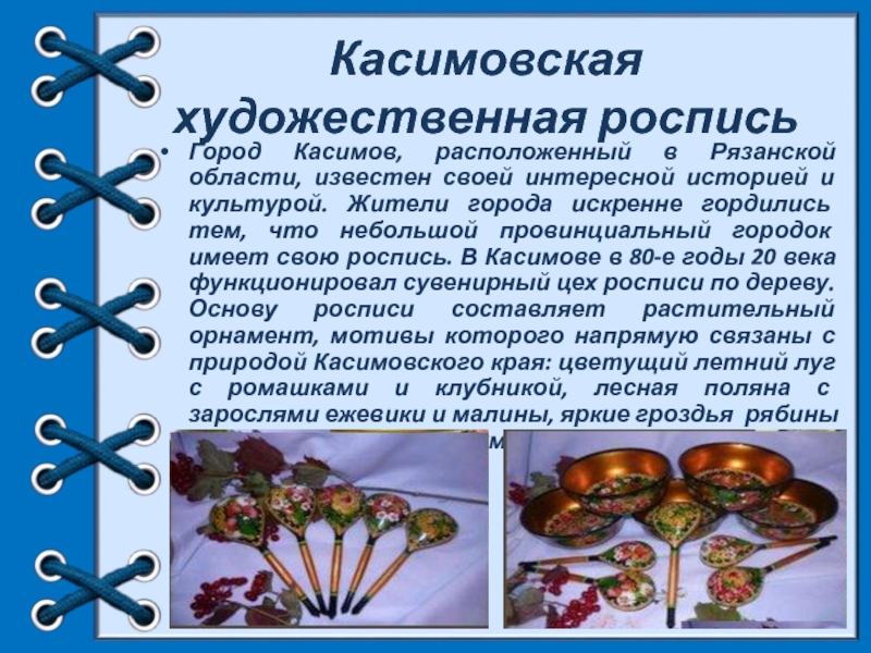 историей и культурой. Жители города искренне гордились тем, что небольшой провинциальный городок имеет свою роспись. В Касимове в 80-е годы 20 века функционировал сувенирный цех росписи по дереву. Основу росписи составляет растительный орнамент, мотивы которого напрямую связаны с природой Касимовского края: цветущий летний луг с ромашками и клубникой, лесная поляна с зарослями ежевики и малины, яркие гроздья рябины и витиеватые стебли хмеля городского пейзажа.