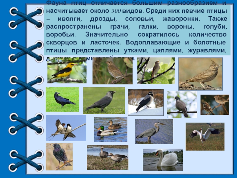 Слайд 73Фауна птиц отличается большим разнообразием и насчитывает около 300 видов. Среди