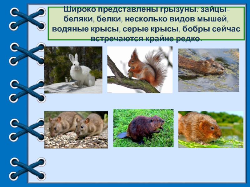 Широко представлены грызуны: зайцы-беляки, белки, несколько видов мышей, водяные крысы, серые крысы, бобры сейчас встречаются крайне редко.