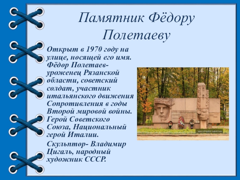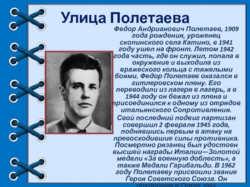 Фёдор Полетаев-уроженец Рязанской области, советский солдат, участник итальянского движения Сопротивления в годы Второй мировой войны. Герой Советского Союза, Национальный герой Италии.