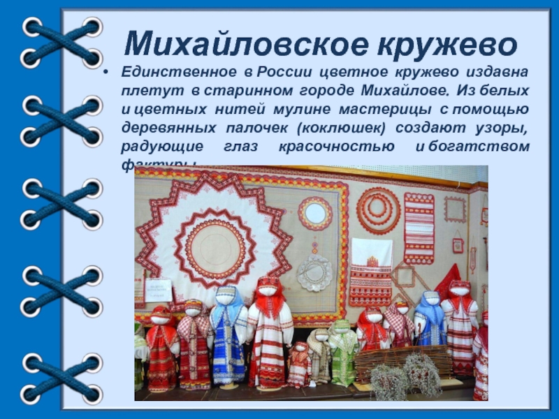 Единственное в России цветное кружево издавна плетут в старинном городе Михайлове. Из белых
