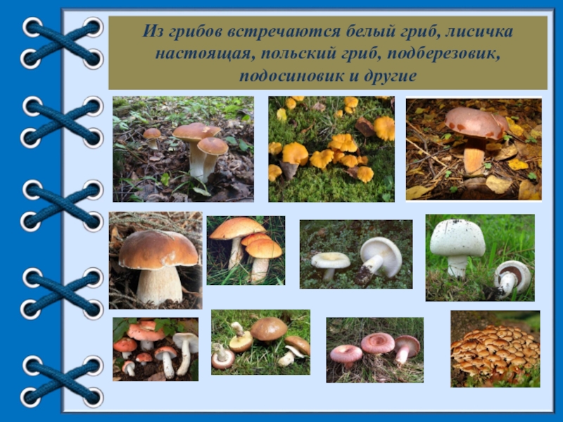 Из грибов встречаются белый гриб, лисичка настоящая, польский гриб, подберезовик, подосиновик и другие