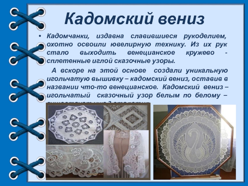 А вскоре на этой основе создали уникальную игольчатую вышивку – кадомский вениз, оставив в названии что-то венецианское. Кадомский вениз – игольчатый сказочный узор белым по белому – существует уже 3 столетия.