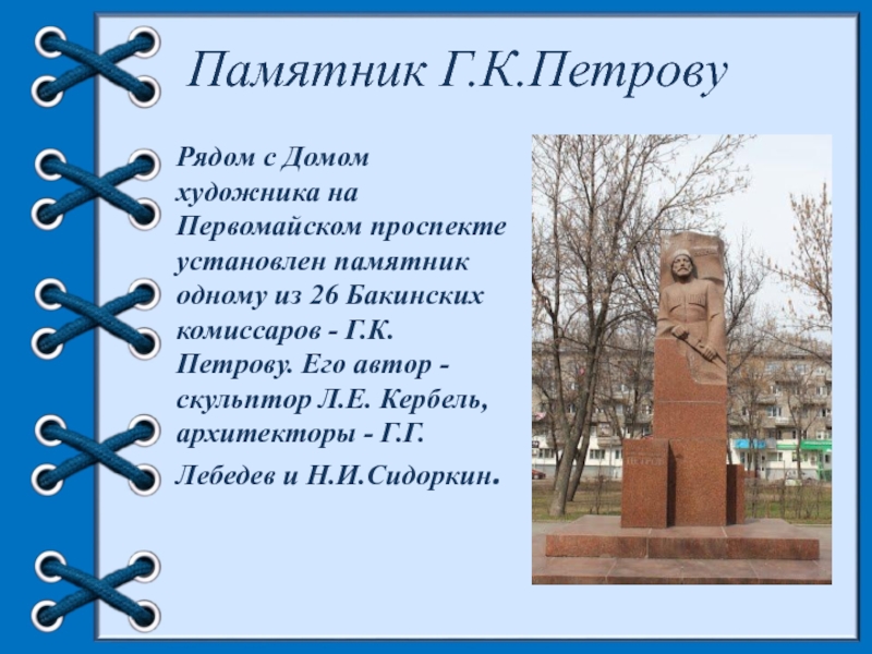 из 26 Бакинских комиссаров - Г.К.Петрову. Его автор - скульптор Л.Е. Кербель, архитекторы - Г.Г.Лебедев и Н.И.Сидоркин.