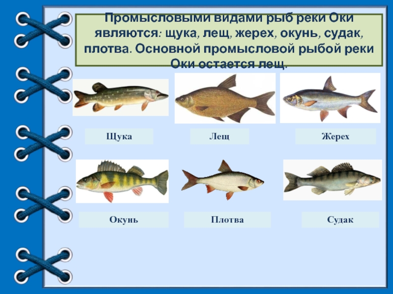 Промысловыми видами рыб реки Оки являются: щука, лещ, жерех, окунь, судак, плотва. Основной промысловой рыбой реки Оки остается лещ.
