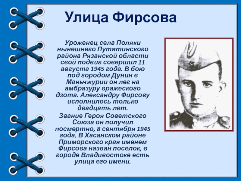 совершил 11 августа 1945 года. В бою под городом Дунин в Маньчжурии он лег на амбразуру вражеского дзота. Александру Фирсову исполнилось только двадцать лет.