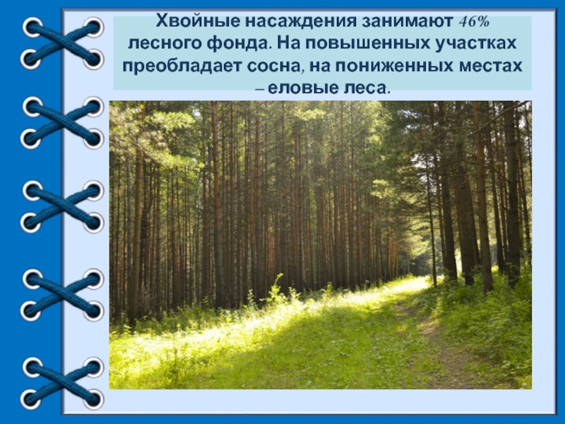 Хвойные насаждения занимают 46% лесного фонда. На повышенных участках преобладает сосна, на пониженных местах – еловые леса.