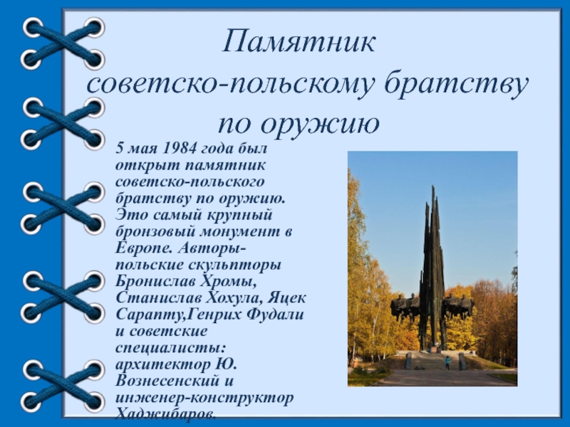 советско-польского братству по оружию. Это самый крупный бронзовый монумент в Европе. Авторы-польские скульпторы Бронислав Хромы, Станислав Хохула, Яцек Сарапту,Генрих Фудали и советские специалисты:архитектор Ю.Вознесенский и инженер-конструктор Хаджибаров.
