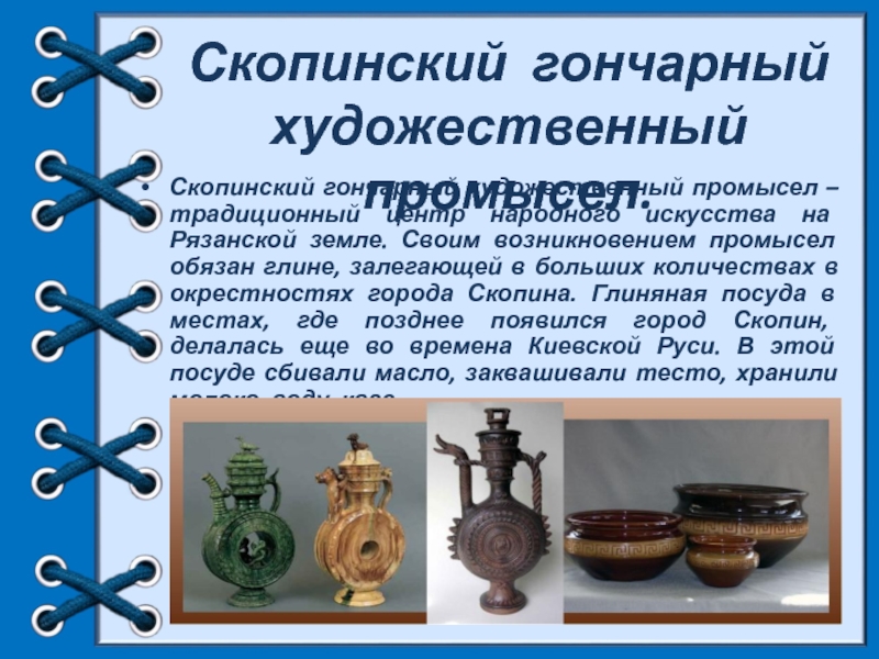 искусства на Рязанской земле. Своим возникновением промысел обязан глине, залегающей в больших количествах в окрестностях города Скопина. Глиняная посуда в местах, где позднее появился город Скопин, делалась еще во времена Киевской Руси. В этой посуде сбивали масло, заквашивали тесто, хранили молоко, воду, квас.