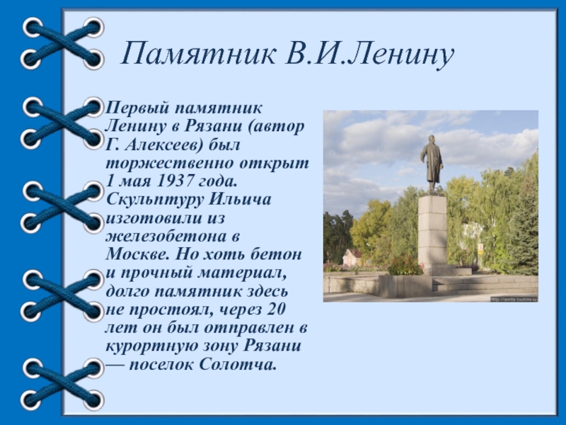 открыт 1 мая 1937 года. Скульптуру Ильича изготовили из железобетона в Москве. Но хоть бетон и прочный материал, долго памятник здесь не простоял, через 20 лет он был отправлен в курортную зону Рязани — поселок Солотча.