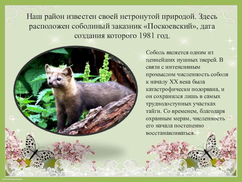 Соболь является одним из ценнейших пушных зверей. В связи с интенсивным промыслом численность соболя к началу XX века была катастрофически подорвана, и он сохранился лишь в самых труднодоступных участках тайги. Со временем, благодаря охранным мерам, численность его начала постепенно восстанавливаться.