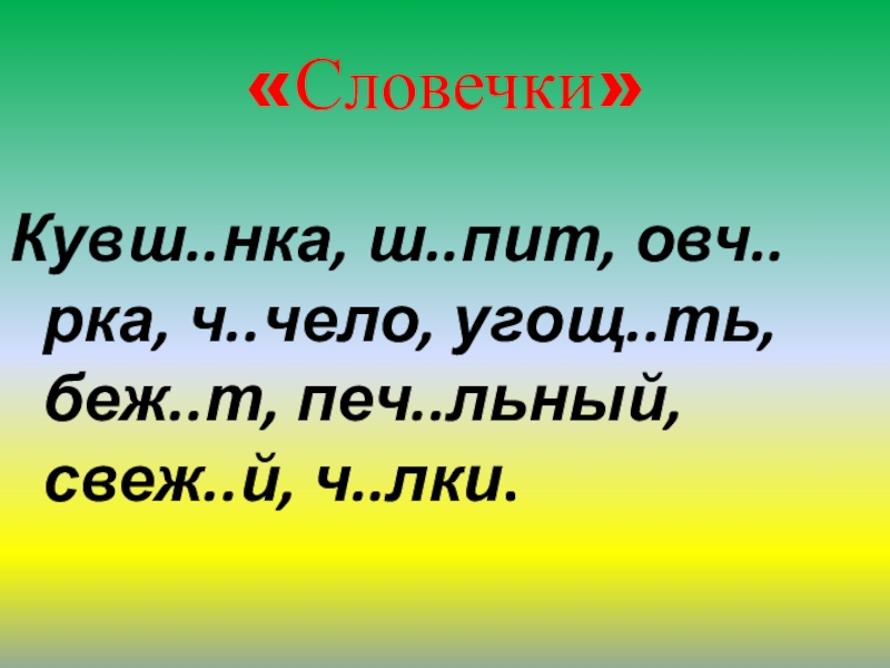 «Словечки»Кувш..нка, ш..пит, овч..рка, ч..чело, угощ..ть, беж..т, печ..льный, свеж..й, ч..лки.