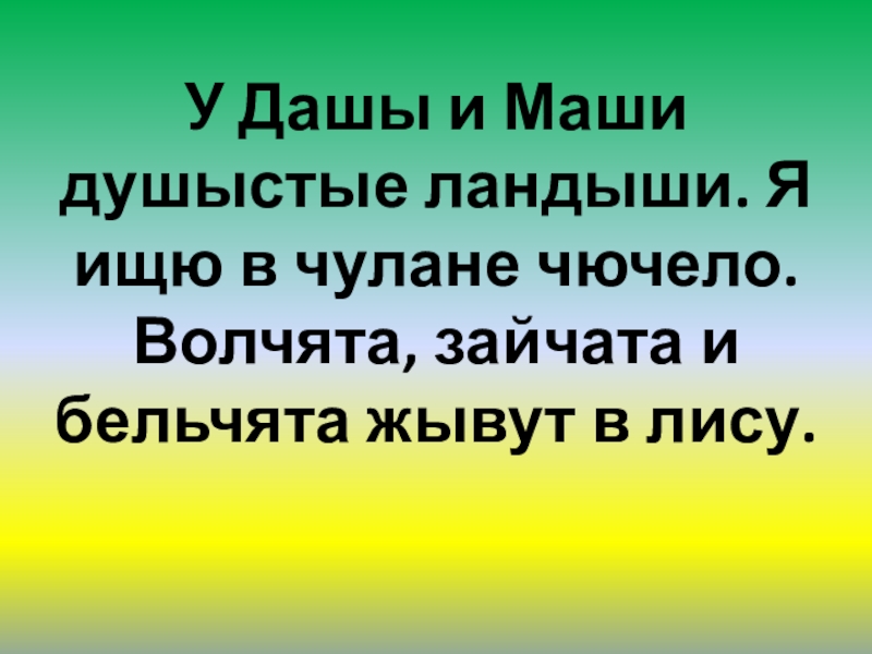 У Дашы и Маши душыстые ландыши. Я ищю в чулане чючело. Волчята, зайчата и бельчята жывут в