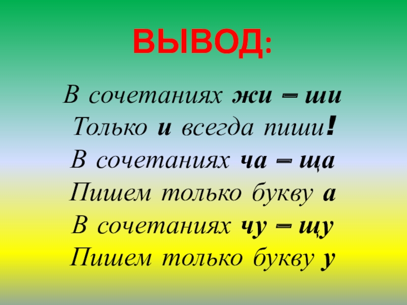 ВЫВОД:В сочетаниях жи – шиТолько и всегда пиши!В сочетаниях ча – щаПишем только букву аВ сочетаниях чу