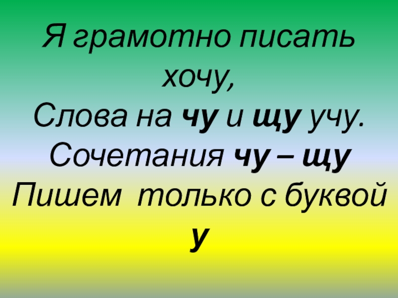 Слайд 11Я грамотно писать хочу, Слова на чу и щу учу. Сочетания чу –