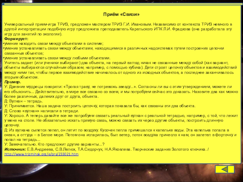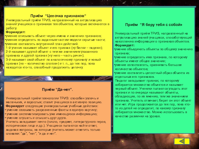 Универсальный приём технологии ТРИЗ: способен увлечь и маленьких, и взрослых; ставит учащихся в активную позицию.