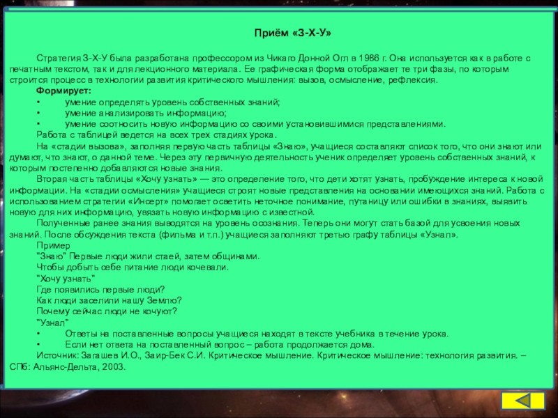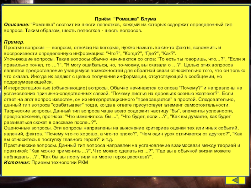 Универсальный прием ТРКМ, направленный на формирование умения задавать вопросы, а также может быть использован для актуализации знаний учащихся по пройденной теме урока.