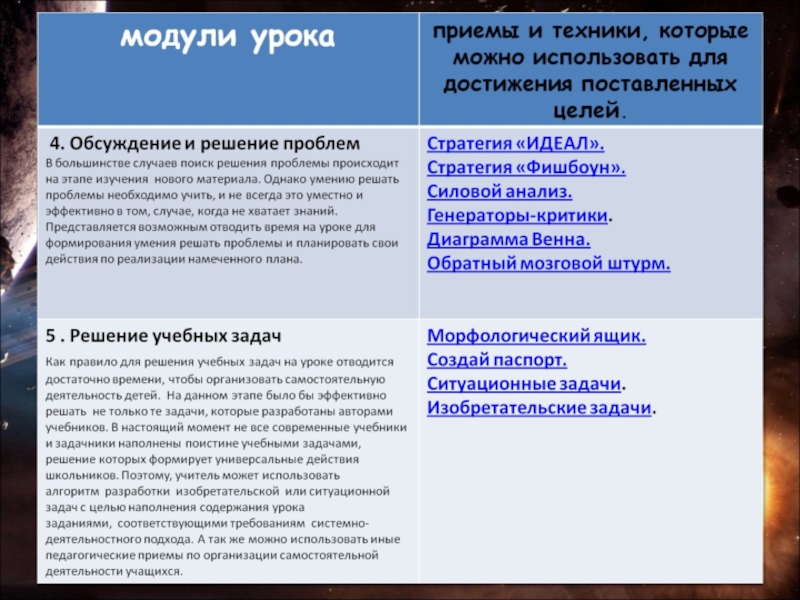 4. Проанализировать полученный сценарий урока с точки зрения системно-деятельностного подхода. Рассмотреть выбранные приемы или техники на предмет использования ИКТ для их реализации.