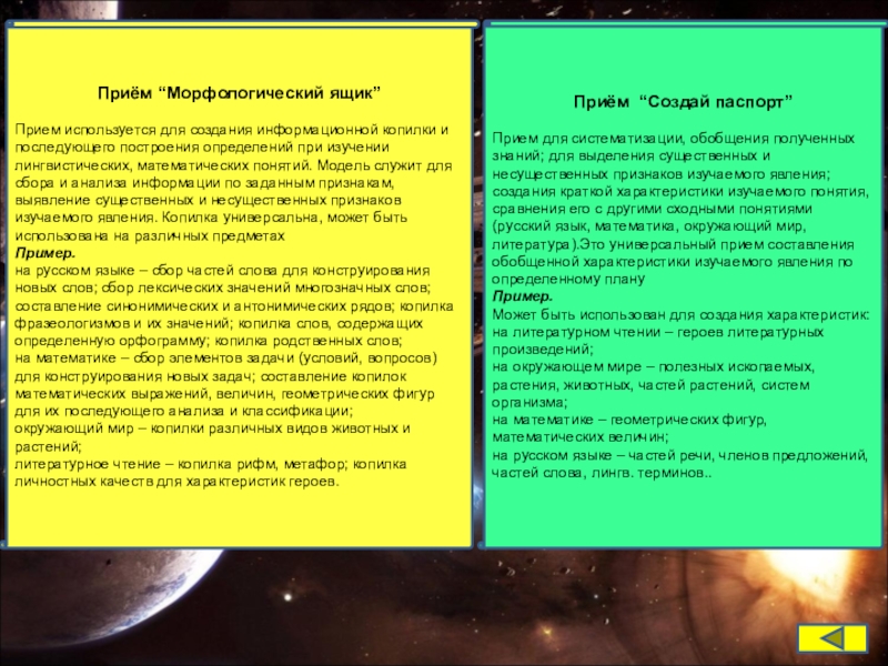 Прием для систематизации, обобщения полученных знаний; для выделения существенных и несущественных признаков изучаемого явления; создания краткой характеристики изучаемого понятия, сравнения его с другими сходными понятиями (русский язык, математика, окружающий мир, литература).Это универсальный прием составления обобщенной характеристики изучаемого явления по определенному плану