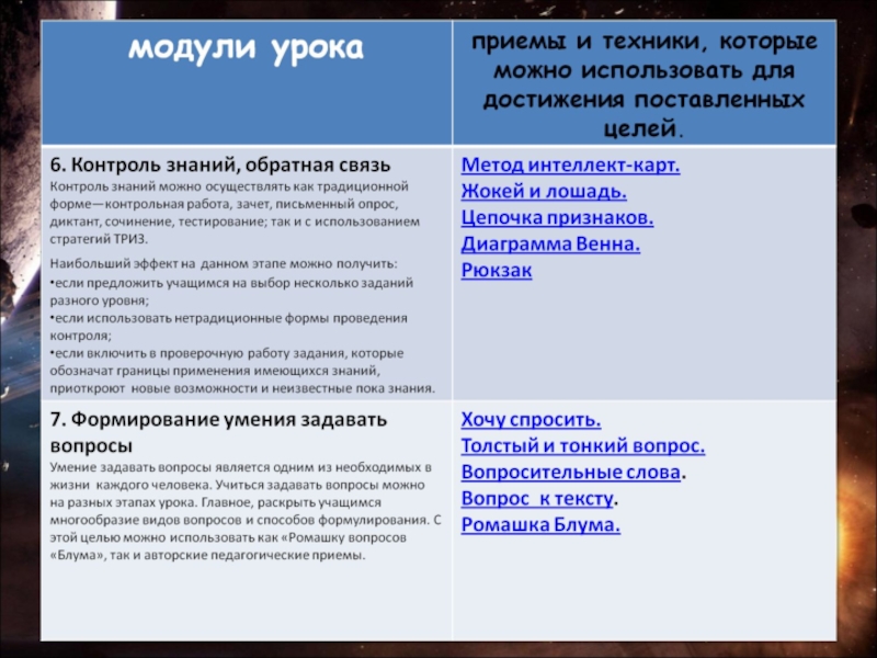 Учащимся предлагается таблица вопросов и терминов по изученной теме или новой теме урока. Необходимо составить как можно больше вопросов, используя вопросительные слова и термины из двух столбцов таблицы.