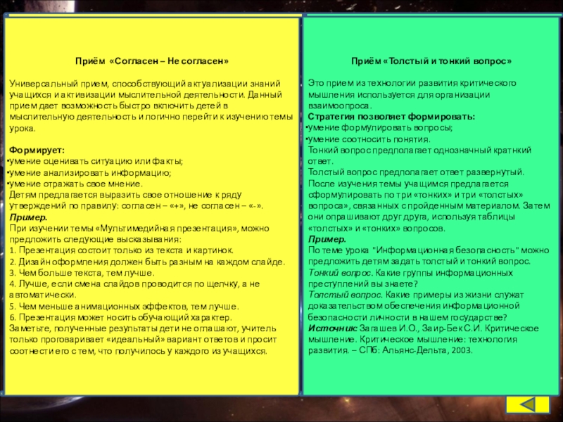 После изучения темы учащимся предлагается сформулировать по три «тонких» и три «толстых» вопроса», связанных с пройденным материалом. Затем они опрашивают друг друга, используя таблицы «толстых» и «тонких» вопросов.