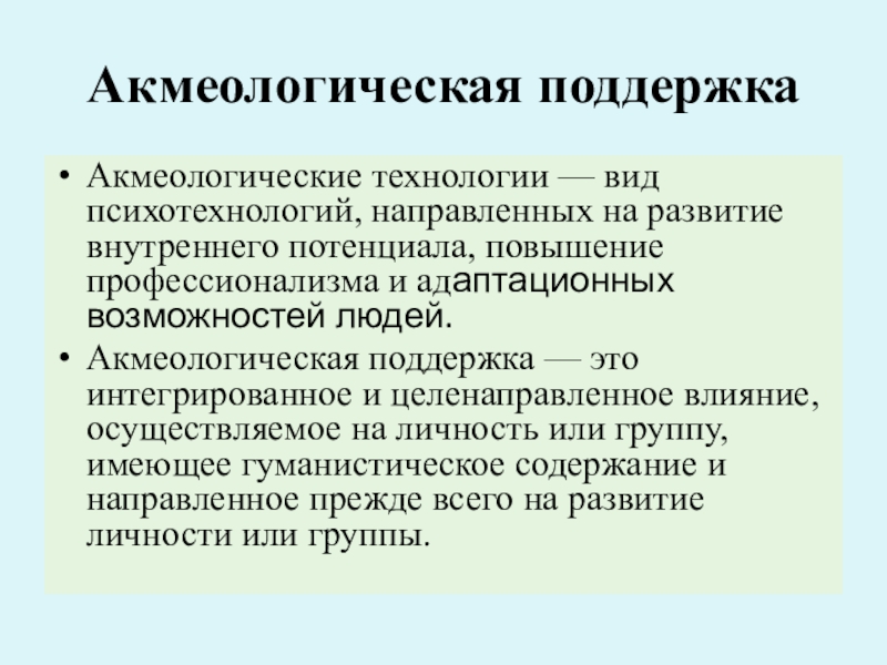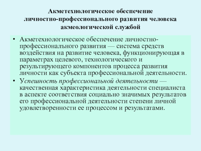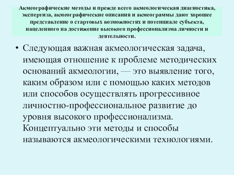 Следующая важная акмеологическая задача, имеющая отношение к проблеме методических оснований акмеологии, — это выявление того, каким образом или с помощью каких методов или способов осуществлять прогрессивное личностно-профессиональное развитие до уровня высокого профессионализма. Концептуально эти методы и способы называются акмеологическими технологиями.